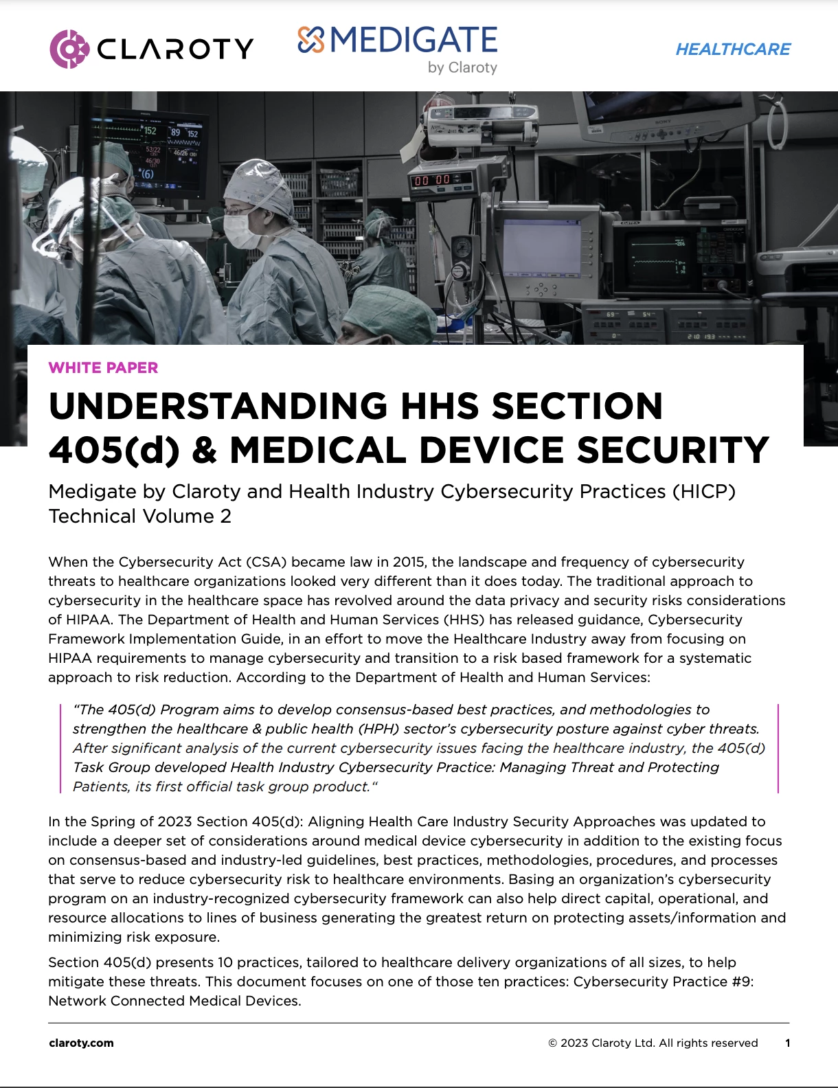 Section 405(d) presents 10 practices, tailored to healthcare delivery organizations of all sizes, to help mitigate these threats. This White Paper focuses on how Claroty supports one of those ten practices: Cybersecurity Practice #9: Network Connected Medical Devices.